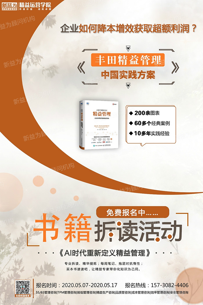 精益實訓基地書籍拆讀活動火熱報名中,想學習更多的精益管理知識嗎?想讓自己成為更優(yōu)秀的精益踐行者嗎?快來報名參加我們的拆書活動吧,本期拆讀書籍為《AI時代重新定義精益管理》